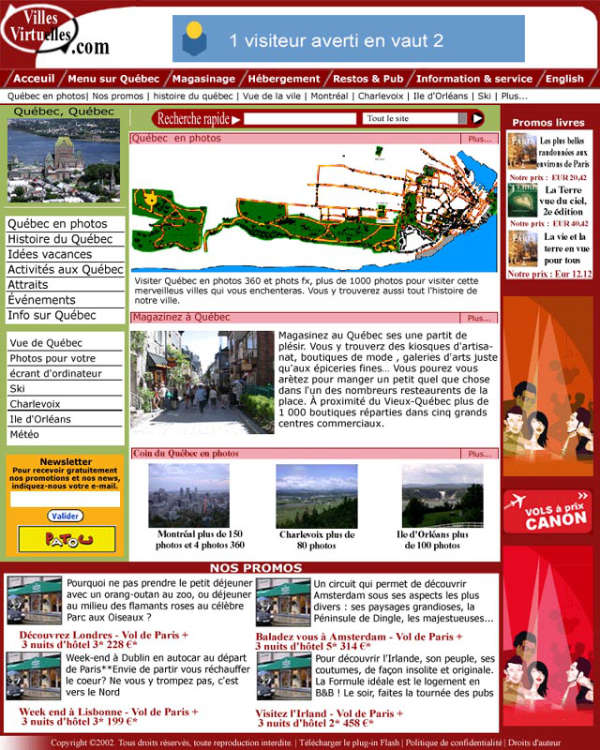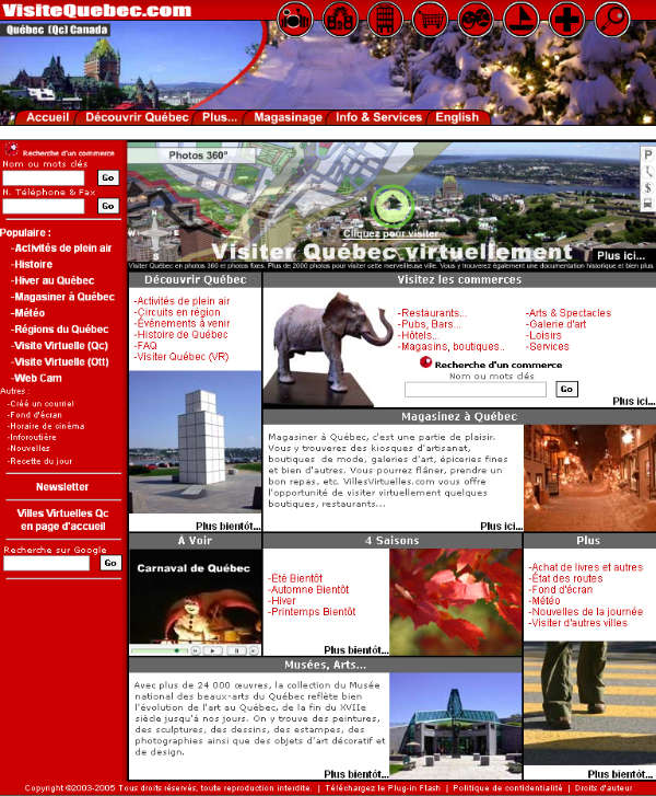 Lancement officiel du site Internet VillesVirtuelles.com, le premier site Internet de ce genre au monde. Le site offre la visite virtuelle des rues, des parcs touristiques de la vieille ville de Québec et d'une quarantaine de commerces. Il y a aussi plus de 80 lieux historiques à découvrir, plus de 50 emplacements proposant des activités, la réservation en ligne de billets d'avion et d'hôtels, la vente de livres de la région de Québec, plus de 2000 recettes, la météo en direct, l'actualité et bien plus.